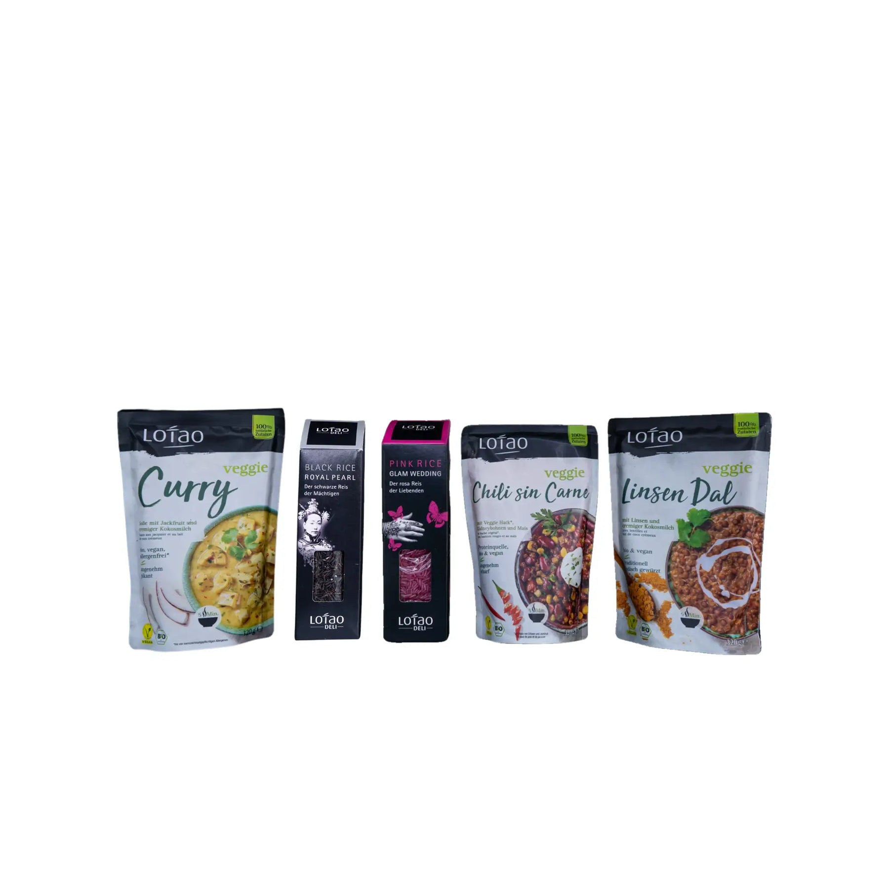 Mit dem Lotao Lunch Kit genießt du abwechslungsreiche Bio-Fertiggerichte für Zuhause, unterwegs oder im Büro. Ob cremiges Curry, herzhaftes Chili, aromatisches Linsen Dal oder unsere praktischen Instant Cups – kombiniert mit edlem schwarzem, rosa oder weißem Reis zauberst du dir im Handumdrehen vollwertige Mahlzeiten, ganz ohne künstliche Zusätze oder Konservierungsstoffe.