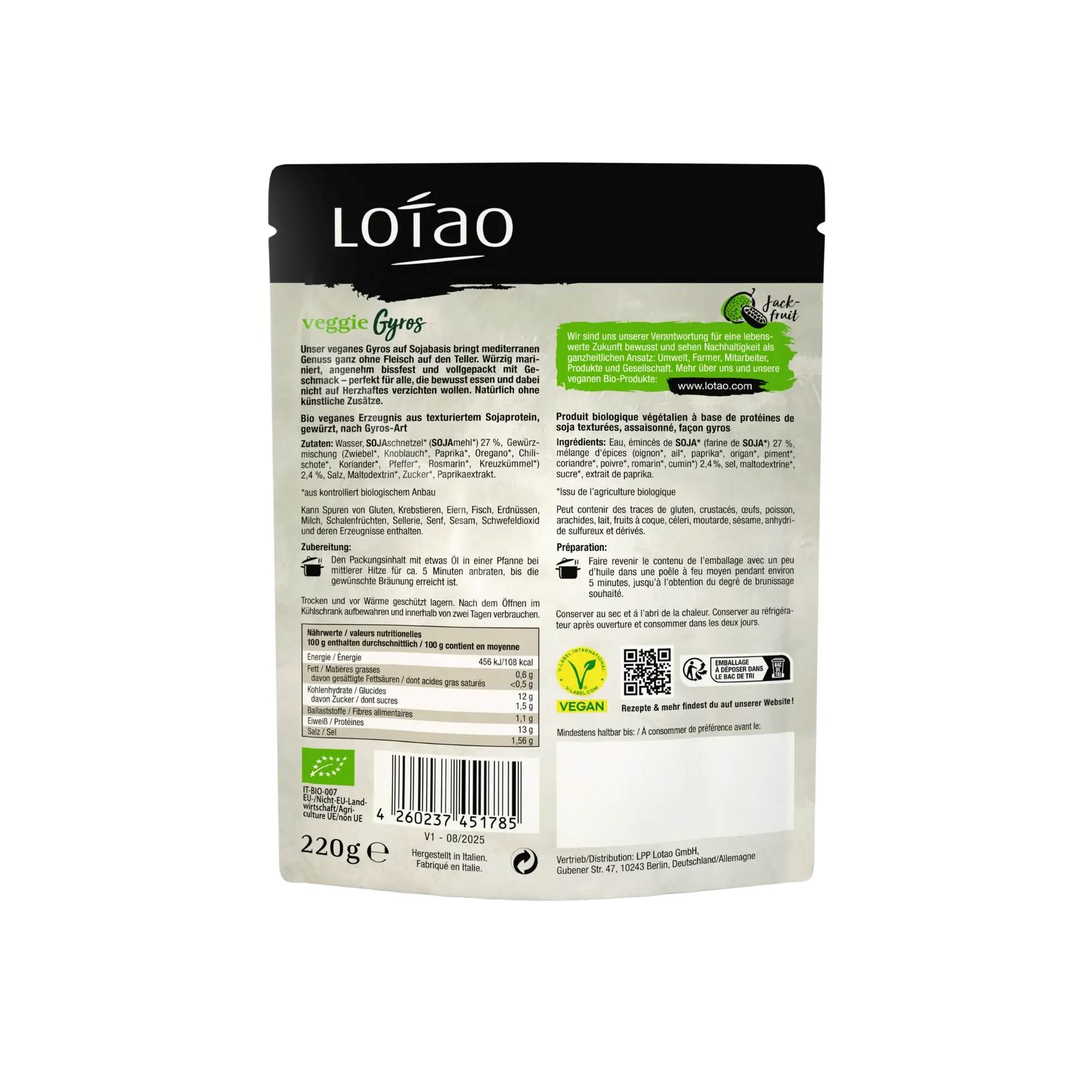 Unser Veggie Gyros bringt mediterranes Flair in deine Küche – herzhaft gewürzt, angenehm saftig und voller Geschmack. Die Basis bildet texturiertes Sojaprotein, das dank seiner Struktur und Marinade besonders authentisch wirkt. Abgerundet wird das Gyros durch eine ausgewählte Mischung aus Bio-Kräutern und Gewürzen wie Oregano, Paprika, Rosmarin und Kreuzkümmel.